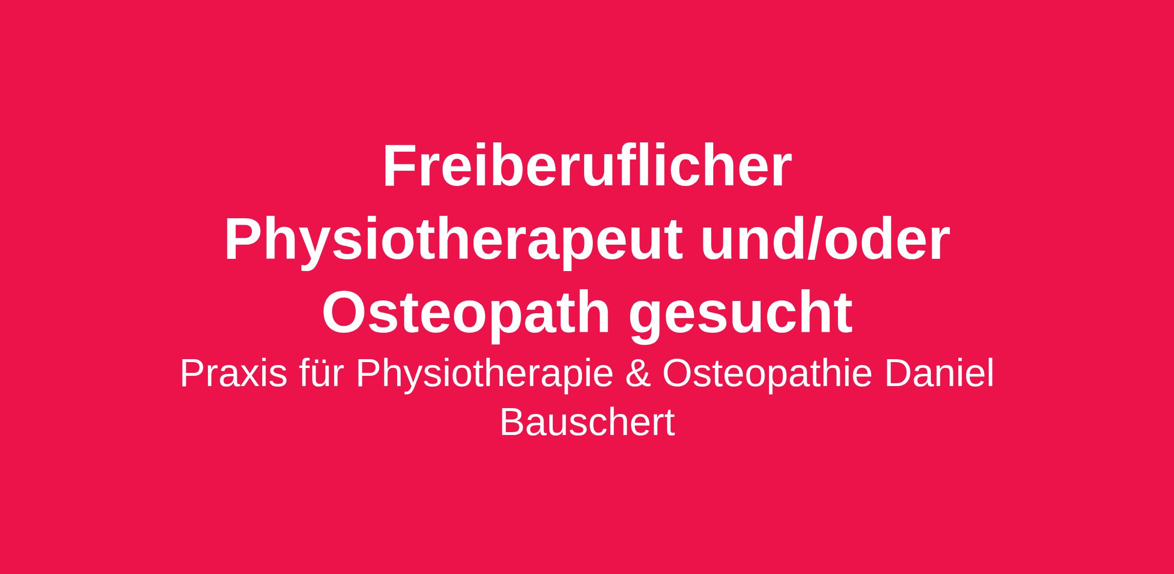 Wir, die Privatpraxis für Physiotherapie & Osteopathie Daniel Bauschert aus 61381 Friedrichsdorf, legen insbesondere Wert auf eine qualitativ hochwertige Behandlung. Kein(e) PatientIn wird unter 60 Minuten behandelt, sodass wir uns vollends den Beschwerden widmen können. Wir verbinden die Physiotherapie mit der Osteopathie und heben uns dadurch von den Mitbewerbern ab. Wir verfügen über lichdurchflutete Behandlungsräume und einen großen Trainingsbereich für die Rehabilitation im 1:1, aber auch für Personal Training, was zu einer willkommenen Abwechslung führt. Getränke sind kostenlos. Der Bahnhof ist fußläufig in 3 Minuten erreichbar. Wir befinden uns im Ärztehaus, anliegend am Einkaufscenter Taunus Carre´. Aufgaben Behandlung und ggf. Training, je nachdem was du für richtig hältst. Qualifikation Zeugnisse haben für uns noch nie eine Rolle gespielt. Komm zu uns und überzeuge uns von deiner Persönlichkeit. Benefits Selbstständiges Arbeiten, ohne Bericht zu erstatten ist unserer Devise. Wir vertrauen unseren Mitarbeitern und funken nicht dazwischen. Was uns am Herzen liegt: Wenn Du über eine Zweitstelle verfügst oder diese in Aussicht hast, passt du in unser Anforderungsprofil. Wir freuen uns über deine Bewerbung!Wir, in unserer Privatpraxis, legen sehr viel Wert auf Qualität. Kein Patient/In wird unter 60 Minuten behandelt, sodass wir uns vollends den Beschwerden widmen können. Wir verbinden die Physiotherapie mit der Osteopathie und heben uns dadurch von den Mitbewerbern ab. Wir verfügen über lichdurchflutete Behandlungsräume und einen großen Trainingsbereich für die Rehabilitation im 1:1, aber auch für Personal Training, was zu einer willkommenen Abwechslung führt. Getränke sind kostenlos, auch sind ausreichend kostenfreie Parkplätze vorhanden. Der Bahnhof ist fußläufig in 3 Minuten erreichbar. Wir befinden uns im Ärztehaus, anliegend am Einkaufscenter Taunus Carre´.