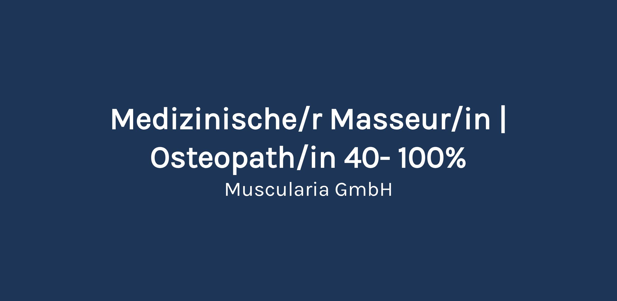 Aufgaben selbstständiges Arbeiten mit unseren Patienten verantwortungsvollesFühren der Behandlungsdossiers strukturiertes Arbeiten nach Anamnese und Befund Qualifikation abgeschlossene oder in der Ausbildung als med. Masseur/med. Masseurin EFA einen guten Umgang mit Menschen ein grosses Interesse an der Naturheilkunde Anerkennung bei EMR, ASCA Verantwortungs- und Ordnungsbewusstsein Benefits eine gute Infrastruktur und Möglichkeiten zur Mitgestaltung Möglichkeit zu persönlicher und fachlicher Weiterentwicklung flexible Arbeitszeiten ein faires Lohnmodell Hast Du Interesse bei Muscularia mitzuwirken, um Dich berufllich zu entfalten? Dann bewirb dich jetzt