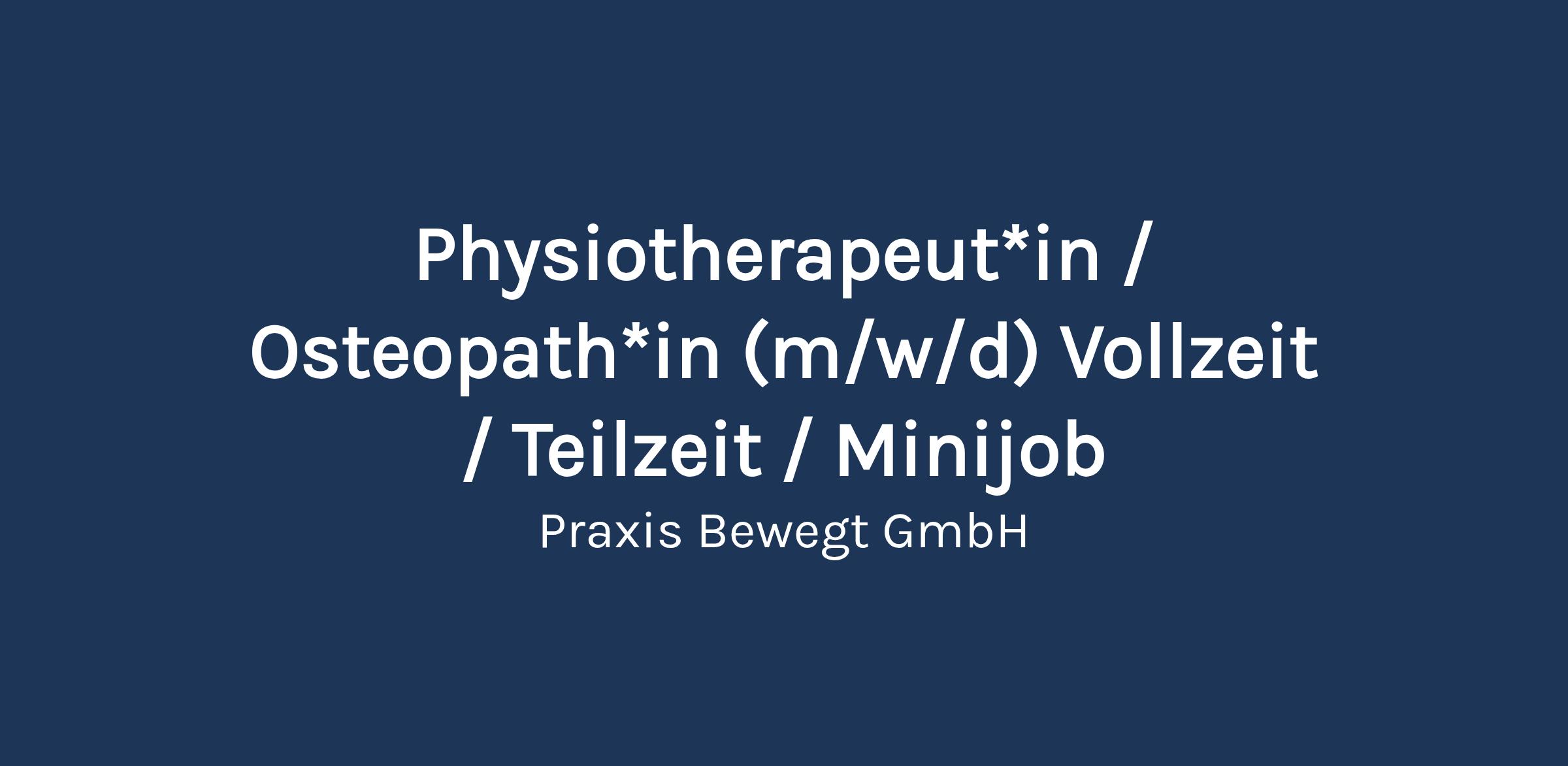Wir sind ein herzliches und engagiertes Team, indem Zusammenarbeit großgeschrieben wird. Humor, Freude an der Arbeit und gegenseitige Unterstützung sind für uns selbstverständlich. Wenn du Lust hast, in einem motivierten Team zu arbeiten, das nicht nur professionell, sondern auch mit Herz bei der Sache ist, dann freuen wir uns sehr auf dich! Physiotherapeut*in und / oder Osteopath*in (m/w/d)Voll- / Teilzeit oder Minijob Wir bieten: flexible Arbeitszeiten 1000 € Willkommensprämie (ab 30 Std./Woche nach bestandener Probezeit) überdurchschnittliches Gehalt 30 Tage Urlaub 2 arbeitsfreie Tage an Heiligabend und Sylvester 2 Regenerationstage (ab 35 Std./ Wo.) Edenred Karte (50 € Sachbezug/ Monat) Fortbildungsübernahme sehr angenehme Arbeitsatmosphäre mit eigenem Behandlungsraum Extra Zeitfenster für Dokumentationsarbeiten Fortbildungsübernahme nach Absprache Dein Profil: Urkunde als Physiotherapeut*in / Osteopath*in Empathie und Offenheit, sowie Spaß an Persönlichkeitsentwicklung selbstständiges und eigenverantwortliches Arbeiten Fortbildung manuelle Therapie wäre wünschenswert, ist aber kein Voraussetzung Haben wir Dein Interesse geweckt? Bitte schick uns eine E-Mail an mit deiner Telefonnummer und wir nehmen Kontakt auf! Weitere Infos findest du auf unserer Homepage unter www.praxis-bewegt.de