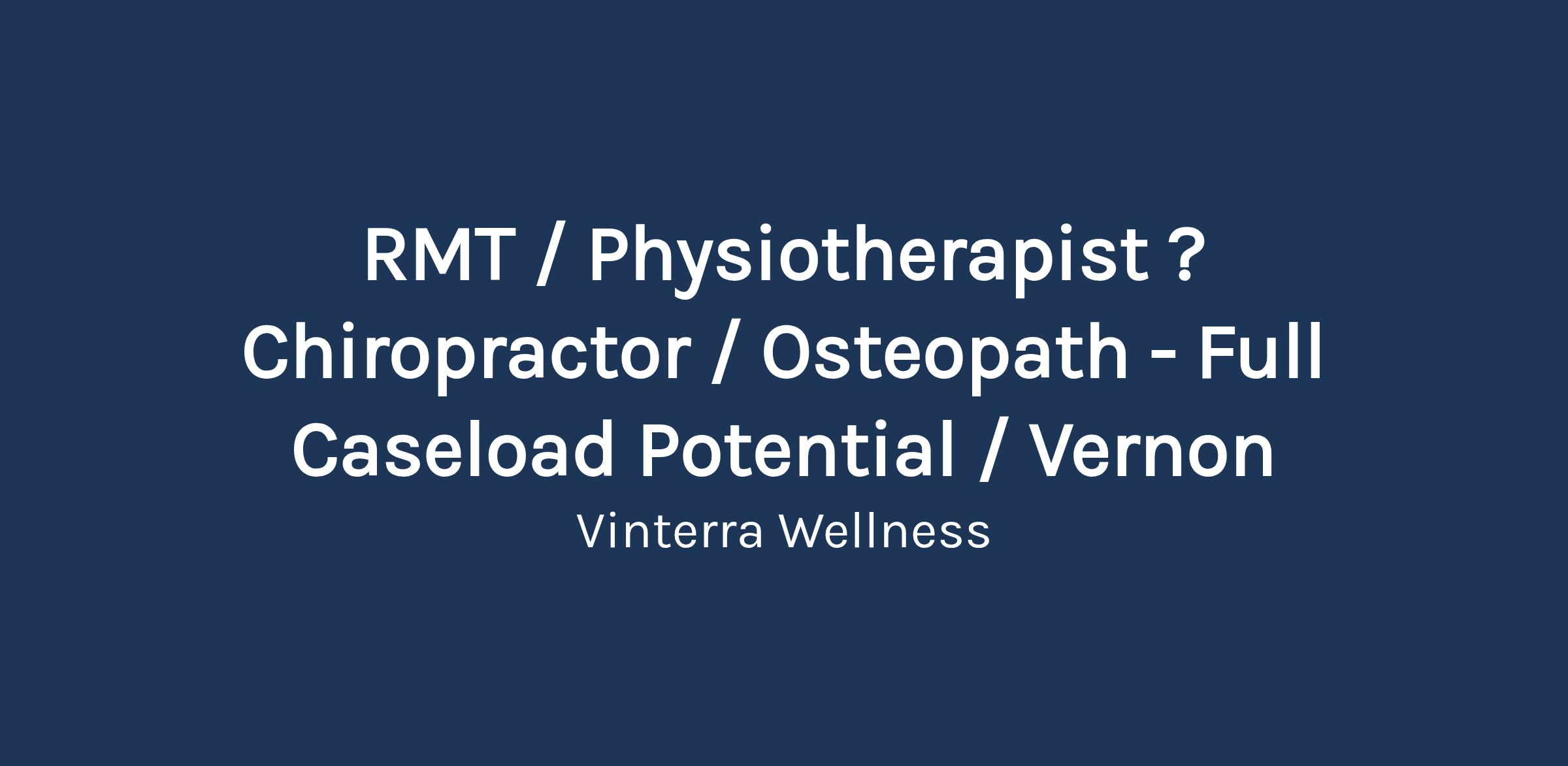 RMT / Physiotherapist / Chiropractor / Osteopath – Full Caseload Potential | Vernon Vinterra Wellness is a growing, multidisciplinary clinic in Vernon focused on high-quality care, strong team culture, and real client flow. We’re expanding and looking for a Registered Massage Therapist, Physiotherapist, Chiropractor, or Osteopath who wants more than just a room rental — you’re joining a clinic that’s building something meaningful. What You Get Consistent internal referrals from counselling + IV therapy clients Fully set-up, modern treatment rooms Jane App (chatgpt://generic-entity?number=0) (booking, billing, charting all done) Ongoing marketing + social media exposure Admin support and brand presence Opportunity to run groups, programs, and workshops Compensation 70/30 split (practitioner/clinic) Strong earning potential with built-in referrals Option to grow into a full caseload quickly Who You Are Licensed in BC (RMT, Physio, Chiro, or Osteo) Professional, reliable, and client-focused Open to collaboration and cross-referrals Looking to grow within a team environment, not operate solo About Vinterra Vinterra Wellness is a multidisciplinary clinic offering: Counselling (individual, couples, families) IV therapy + naturopathic support A growing team with plans to expand into physio and acupuncture We focus on whole-person care—mental and physical health working together. Schedule Expectation Minimum 1–2 days per week to start Opportunity to scale up quickly If you’re looking for a clinic where you can build a strong practice without starting from scratch, we’d love to connect. Apply through Indeed or email: info@vinterrawellness.ca Job Types: Full-time, Part-time, Permanent Pay: $40,000.00-$125,000.00 per year Expected hours: 10 – 30 per week Benefits: Casual dress Company events Flexible schedule On-site parking Store discount Work Location: In person