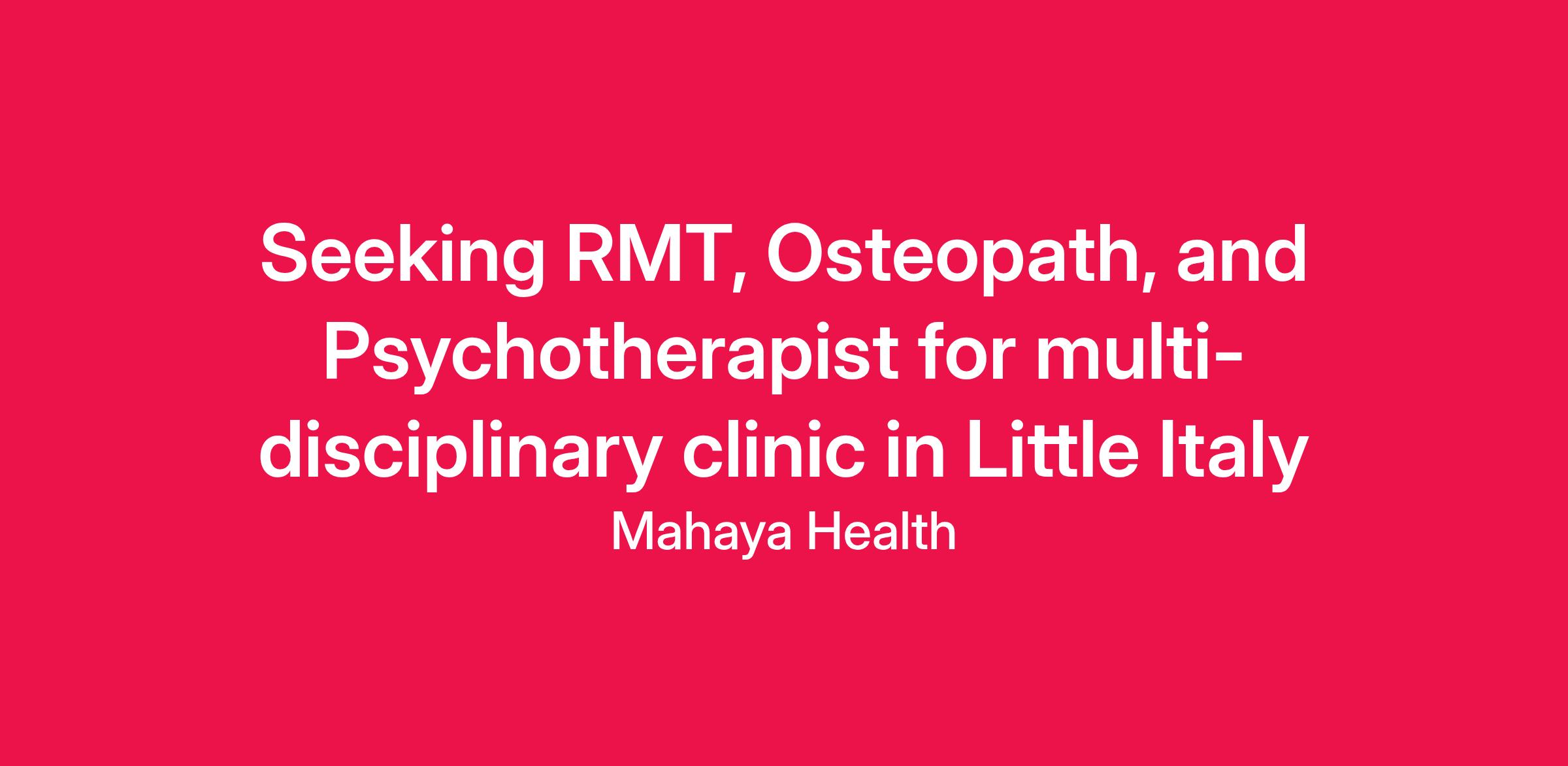 Mahaya Health is an established multidisciplinary health clinic in the heart of Little Italy, downtown Toronto. We are currently looking for a Registered Massage Therapist, an Osteopath, and a Psychotherapist (RP, RSW) to join our team starting in March 2026 at our newly renovated location. Our clinic is designed for like-minded professionals who maintain their own private practices while benefiting from a collaborative, supportive environment. We offer our practitioners: A collaborative work environment with cross-referrals and co-hosted events An existing client base and a monthly newsletter reaching over 500 people All medical equipment and laundry services Online booking and EMR systems Features on the clinic website and marketing platforms About the space: Three sound-proofed private treatment rooms with large windows One multi-purpose treatment/group room A bright common waiting area and tea lounge Staff kitchenette Located on the second floor at College & Grace (staircase access only) Rooms are available for rent by the half-day or for multiple days per week. This is an excellent opportunity to build or expand your practice within a connected network of care. Job Type: Freelance Pay: $120.00-$160.00 per hour Work Location: In person